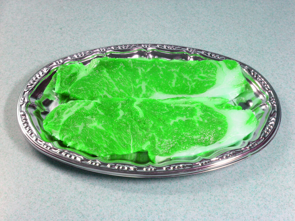 そんなくだらないことを思い出してしまった。肉をうまそうに撮ることにはやはり興味が持てないし、緑色の肉には、気持ち悪いと言いながらも惹かれるものがある。35年たっても、わたしは基本的に進化してないらしい。
