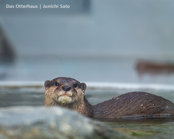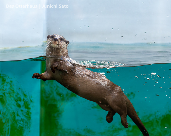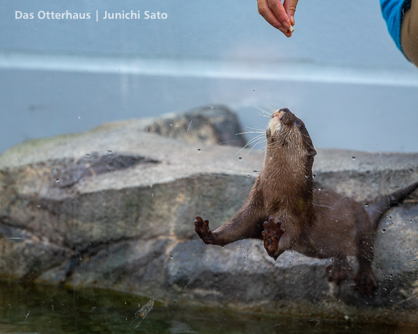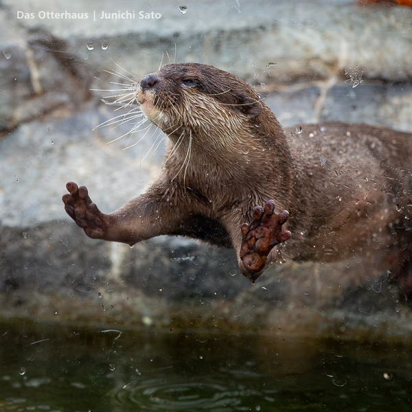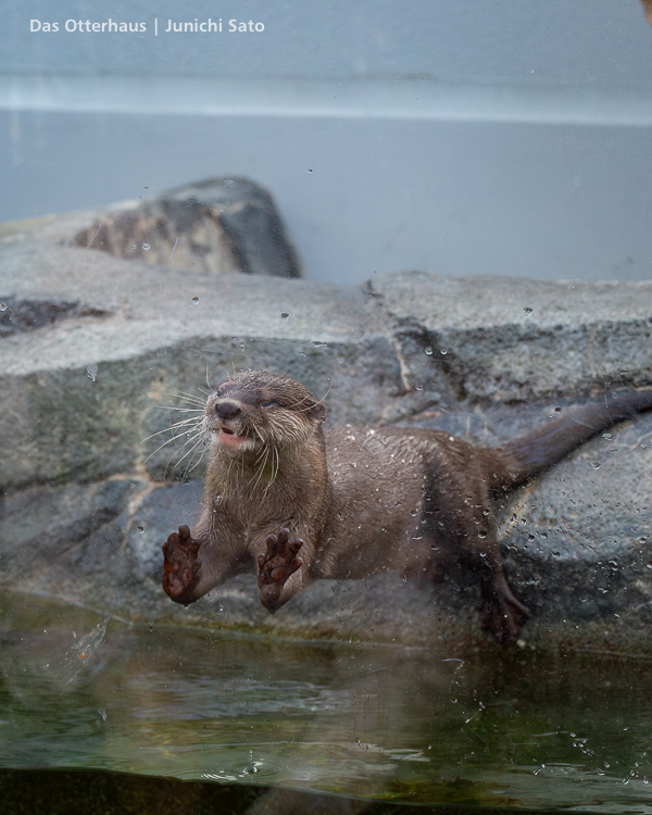 そして、ここからが見事でした。岩とアクリルまでが近いのを逆手に取って、ナズナに水路上でブリッジをしてもらってます。カワウソがこんな姿勢で停止してくれることは普通ないので、体の細部がよく見えるというわけです。