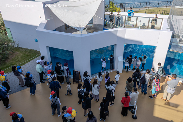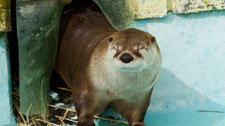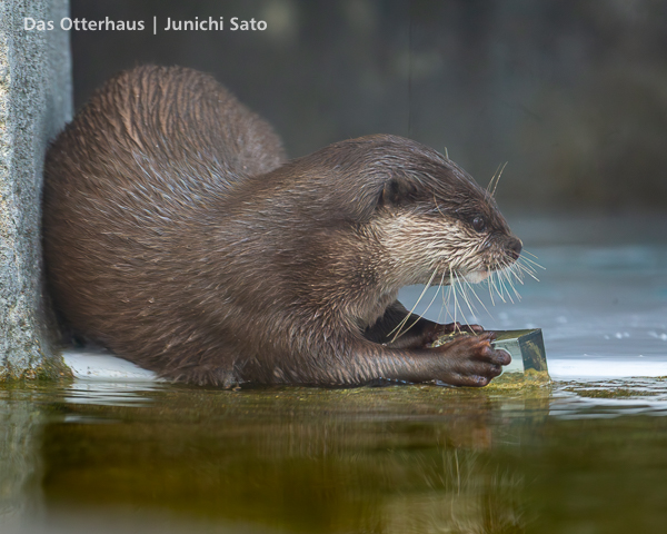 水路はだんだん広くなるので、横に移動するとやがてグリップ力が限界に達して、水に落ちるわけです。観覧者側からは、コツメカワウソの前脚の「手のひら」の様子が、ものすごくよくわかります。これ、芸とはちょっと違うんですね。飼育されている動物を飽きさせず、日々筋力を使うための何らかの目標を設定し、そして達成に導く・・・という素晴らしい飼育技術の一部です。飼育動物だって日々の生活があり、それが単調なものになってはよくないです。そのための動作の複雑化を、実にさりげなくやってのけているところがすごいなあと。