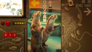 海に囲まれた日本では、水族館は海沿いの風光明媚な場所に建っていることが多いわけですが、四国水族館もかなりレベルの高い「美ロケーション」にありますよね。もっとも多くの場合、カワウソ展示はその恩恵に浴することもなく、目立たない場所でひっそりやっているわけです。と言うわけで、こんな妙な写真がトップに来てしまって申し訳ないです。なんでまたこういう姿勢になっているのか?は後で説明しましょう。