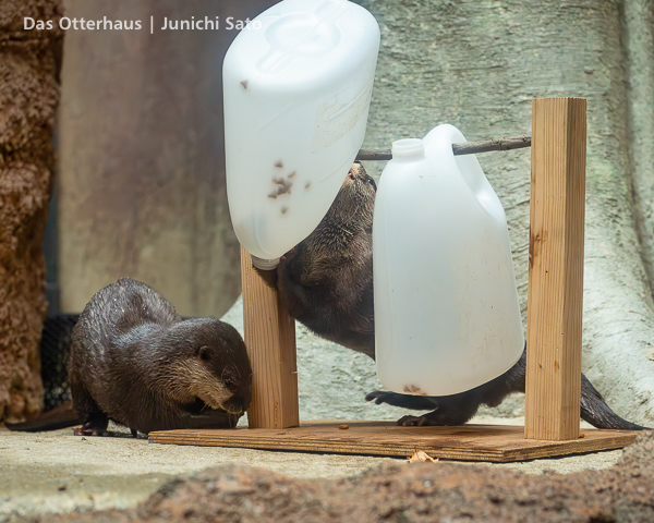 このポリタンフィーダーもツイン化されているところが素敵ですね・・・と思ったけど2頭でそれぞれ別に使う、という場面は見なかったような気もします。2頭で使うときは1頭がカリカリを一生懸命に振り出して、もう1頭が落ちたのをかっさらう、みたいな展開が多いみたい。それも2頭が協力している行動、といえばいえるかもですね。