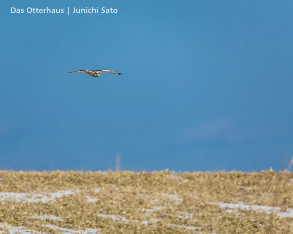 陸の方ではコミミズクがふわふわ飛んでいます。このスポットでよく見られるそうです。それにしても昼にフクロウ科が飛んでるのはすごいなあ。