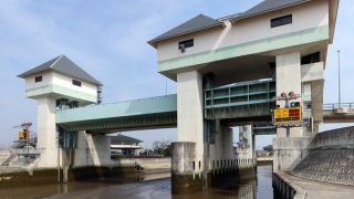 東雲の高層マンション群やオシャレ系団地には、臨海高速の東雲駅じゃなく、地下鉄有楽町線の辰巳駅で降りてこの橋を渡るのがメインルートらしい。つまりこのエリアに住むサラリーマンやOLさんたちは、毎日朝晩この水門を横目で見ながら通勤しているということ。ちょっと不意を突かれた感じがする。東雲に住む、というのはそういうリアリティが付属するのか。今まで表側(公園や辰巳JCTのある方)からしか見ていなかったので、東雲エリアとは全く関係ないと思ってたよ。