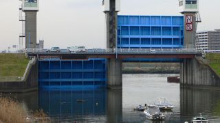 その辰巳桜橋の、展望エリアから見た辰巳水門。時期的にやたらと吐瀉物の跡が多くてイヤだった。撮影してて胃液が逆流しそうになった。おい、水門見ながら吐くなよーと言いたくもなる。