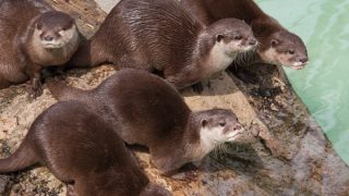 ベビーズ4頭が放飼場に出てくるのはポンタに任されています。昨年8月10日生まれのスーヌーピーのときは、2か月後の10月10日に寝室のドアを日中開放したのだったと記憶しています。わたしが見に行ったのは10月14日で、お子たちはドアの周辺で出たり入ったり。カラスが接近したりすると、ポンタがみんなを連れて脱兎のごとく寝室に駆け込んだものでした。嫌がるお子たちを水に浸けたりする姿(写真集「カワウソ」p.38-39)が見れたのも、この日のこと。