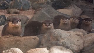 コツメカワウソは狭いすき間があると必ず手を突っ込む習性(そうやってえさを探す)があり、この握手パイプはそれをうまく利用しているのですが、何度見ても面白いものです。
