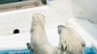 スタンディング中は人っぽいが、直立姿勢が崩れるときにホッキョクグマの体型(特に首の長さ)がよくわかる。