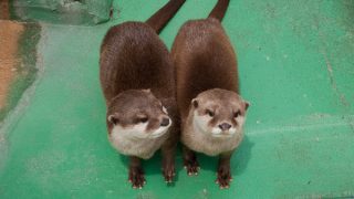 今日もいい天気で、たまたま通りかかったお客さんもカワウソ展示場に集まってきます。みなさんはかなりラッキーな方々です。よかったですね!