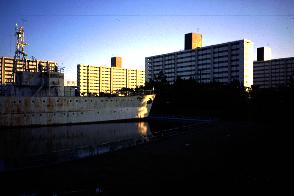 手前の船は千葉市海洋公民館。昭和19年に海防艦「志賀」として誕生し、その後博多~釜山の米軍連絡船、中央気象台定点観測船、海上保安大学校練習船を経て昭和40年に廃船。千葉市が払い下げを受けて改装し、翌年公民館として利用開始した。これだけであればまあまあありそうな話で、わざわざ見にいくようなものでもなかろう。面白味は、この船の公民館が係留されていた稲毛海岸一帯が、昭和44年から埋め立てられてしまうところにある。この船の周囲だけ海を残して、周囲が埋め立てられてしまったわけである。今でもこの船は、海岸線から2キロほど陸側で海に浮かんでいる、という構図だ。1万分の1の地図であれば、全長79メートル足らずのこの船の形状は、しっかり地図上に刻み付けられてしまう。地図に捕捉されてしまった船というのも、何だか微笑ましいような情けないような姿ではある。