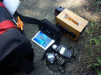 たまには機材のことなど考えてみようと思う。写真は機材がないと成立しない。しかし機材にこだわることは必ずしも作品が成立する条件ではない。佐藤は機材に淡泊だ、と思われているフシがあるが、それは単にお金がないことと、弘法筆を選ばずを決め込んでいるためであって、そりゃあわたしだって正直言っていいカメラ、レンズは欲しい(でも買えない)。それはそうと、最近はデジタルカメラ(Kodak DC210)とご覧のような自作4×5ピンホールカメラをバッグに入れて撮影に出かけることがほとんどだ。以前のプロジェクトでは自作8×10ピンホールカメラとジッツォのくそ重い三脚を担いで河原や海岸を歩いていたものだ(車は、ないっ!)。ある人に「まるで行者のようだ」と言われていい気になってたが、腰を痛めて以来、何となくこのスタイルは気が乗らなくなってしまった。代わりに今使っている4×5は三脚を使わないで地べたで撮れるように固定アオリ(要はピンホールがセンターからオフセットして付いているだけ)になっている。レンズキャップが三連になっていて結構ものものしいが、仕組みはぜーんぜん大したものではない。単純だからほとんど絶対に壊れない。フィルムホルダは重いので持ち歩かず、ポラバックつけっぱなしにしてクイックロードのフィルムのみ使っている。これだけがささやかな贅沢である。何でこんなことくだくだ書いているかというと、どうも人間には二通りの生き方があるようで、自分の意図通り環境を変革していくタイプと、自分の意図が環境によって定義されていくタイプだが、わたしはもう完全に後者であるということだ。一般にこの違いは、積極的であるか消極的であるかという二元論で片づけられてしまうことが多い。そんなわけで以前は何となく自分の方法が消極的なのではないだろうかと考え込んでしまうことがあったが、最近はいや、これは柔軟構造をしているのだよと笑っていられるようになった。今あるものでその場でなんとかする、という方法論は経済発展が止まったこれからが本番だろうと思う(笑)。