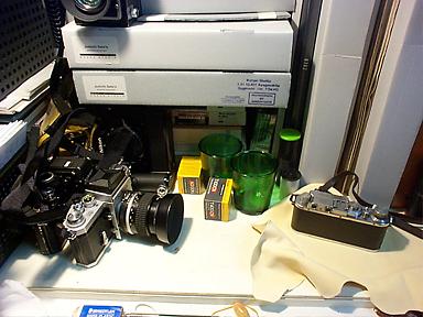 このところ人間が腐ってきたなあなんて思ってたら、カメラも腐れてた。一昨日、そのへんにころがしてあったニコンFのシャッターを何気なく切ったら音がおかしい。見るとミラーが当たる部分のスポンジ(モルトプレンなんて呼ぶ)がねちょねちょになっておった。友人から引き継いだいわく付きの大事なカメラだ。たしか最近オーバーホールしたやつをもらったはずだったのにと思って修理票(元箱に昭和40年当時の値札、修理票までいっしょにくれた。律義な友人である。最近どうしてるかな)を見ると、1991年とある。すでに7年たってる。7年経てばモルトも腐るわな。他の部分は全然問題ないので、自分で直すことにする。ちょっと硬めだが手元にあった発泡性のゴムを切って部品を作り、純正ねちょねちょを取り除いて貼り付ける。ついでに蒸着の浮きが出ているペンタプリズムをはずして、F2用のウエストレベルファインダのネームプレートをはずしたものと取り換えた。おー、これはイケる。んなことやってうちに、他のカメラもいじりたくなってきた。そういえばF2のミラーの音が大きくなっていたのが気になってたっけ。どうもミラーダンパがちゃんと動いてないようだ。軽く開けて軸とバネにちょっと注油。それからそこいらじゅうのカメラ(他はろくなものがない)のシャッターを切って、磨いてしているうちに久しぶりの休みは終わってしまった。その後で持ったデジタルカメラのまあ軽いこと。